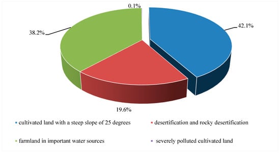 The first problem was that some farmland had to be returned to forest. We found that in the sample counties in 2017 (Figure 6), there were 1.6 million hectares of cultivated land with a slope of 25 degrees, facing severe desertification and rocky desertification, cultivated land with a slope of 15–25 degrees and important water sources, and severely polluted cultivated land. These degraded areas accounted for 26.7% of the total cultivated-land area. Basic farmland among the returnable farmland accounted for 12.9% of the total farmland area of the sample counties.