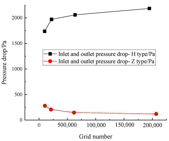 Mesh size will have a certain impact on the results, too few grids will lead to poor accuracy of the calculation results, but too dense grids will increase the calculation cost and accuracy is limited, so grid independence verification must be carried out to obtain the comprehensive accuracy and calculation cost of grid number selection As can be seen from Figure 3, with inlet and outlet pressure drop and calculation time as evaluation indexes, after the number of grids reaches 600,000, the calculation time increases significantly with the increase of the number of grids, but the increase of calculation results is not obvious. Based on the calculation results and efficiency, the number of grids selected for H-fin and Z-fin is 600,000.