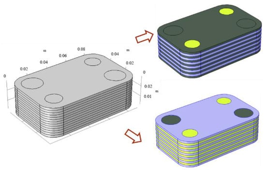 - Du, J.; Zhao, H. Numerical simulation of a plate-fin heat exchanger with offset fins using porous media approach. Heat Mass Transfer 2018, 54, 745–755. [Google Scholar] [CrossRef]