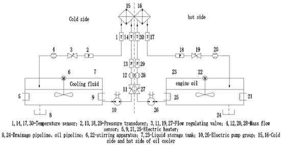 The oil cooling test bench is a closed loop system, as shown in Figure 6. It is mainly composed of temperature sensor, pressure sensor, mass flow sensor, electric pump group, electric heater, flow control valve and circulation pipeline. The inlet and outlet pipelines of the cold side and hot side were equipped with 0.2-class Pt100 thermal resistance, 0.5-class pressure sensor and 0.15-class Coriolis mass flow sensor to detect the temperature, pressure and flow of the fluid respectively. The detailed information of the experimental bench can be referring to references [28,29].