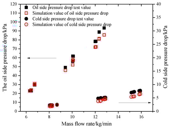 The pressure drop of test and simulation varies with the flow rate of oil side and cold side.