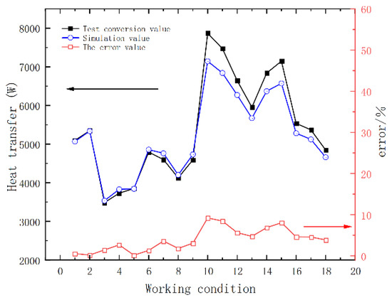 In order to verify the effectiveness of the whole model for heat transfer process simulation, the heat transfer obtained from experimental conversion and numerical simulation are studied, and the results are shown in Figure 8.