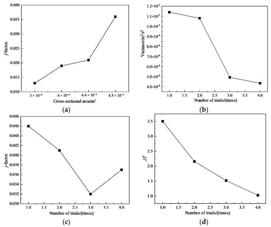 In the analysis of different flow channels, we can change the cross-sectional area of the flow channel by changing the width and height of the flow channel. It is expected that the uniformity of velocity distribution in the same passage will change when the cross-sectional area changes. The analysis results are shown in Figure 10. It can be seen from Figure 10a,b that the flow factor f decreases, and the variance of the velocity in the flow passage also decreases, indicating that the flow performance is better. It can be seen from Figure 10c that with the decrease of j, the heat transfer gradually decreases, indicating that the smaller the cross-sectional area, the better the heat transfer performance. Figure 10d shows that the flow exchange performance of heat exchanger decreases with the increase of cross-sectional area.