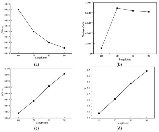 It can be seen from Figure 11a,b that as the length of the flow passage increases, the velocity variance in the flow passage also decreases, and the fluid velocity distribution in the flow passage becomes more uniform. Therefore, in order to ensure the uniformity of flow rate in the flow channel, the length of the flow channel should be increased as long as possible on the premise of guaranteeing the heat transfer score. As can be seen from Figure 11a,c,d, the flow and heat transfer performance gets better and better with the increase of length.
