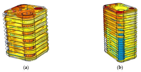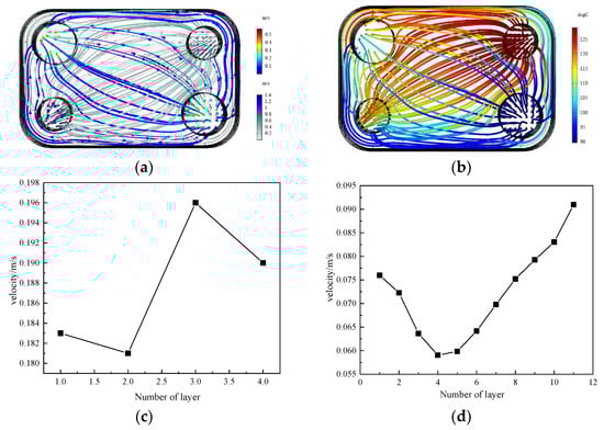 From Figure 12c,d, it is obvious that when the number of layer increases, the velocity of the fluid in the flow channel decreases obviously, and the flow rate in the same flow channel is more uniform, which is conducive to the heat transfer of the heat exchanger. In addition, the flow velocity distribution between different layers in these two working conditions needs to be studied and discussed further. Calculation results of flow field and temperature field of oil cooler are shown in Figure 12a,b. By comparing Figure 12c,d as well as the data can be found in Figure 13b, with the increase of flow channel layer, the average flow velocity of each flow layer not only changed, but also the speed of the fluid flow layer gap is in constant decreases.
