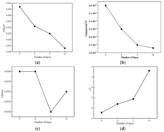 It can be seen from Figure 13a,b that the number of flow channel layers has a certain relationship with the variance of the distribution of flow channel velocity. With the increase of the number of flow channel layers, the variance gradually decreases. Therefore, in the actual design process, under other conditions, the number of flow channel layers should be increased as many as possible to improve the flow performance. In addition, it can be seen from Figure 13c,d that with the decrease of j, the heat transfer gradually decreases, indicating that the smaller the cross-sectional area, the better the flow and heat transfer performance.
