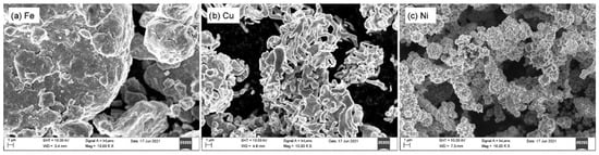 In Figure 1, the morphologies of milled iron, copper and nickel powders are illustrated. The Fe sample (Figure 1a) is characterized by micrometric particles with a heterogeneous size distribution estimated in the range of 2–30 μm. The surface of Fe particles appears to be relatively smooth, possibly due to the disc milling treatment. The Cu sample (Figure 1b) is characterized by micrometric particles with dimensions lower than 75 μm, in accordance with the manufacturer’s information. Cu particles resemble agglomerates of rounded and tapered formations. The Ni sample (Figure 1c) has a homogeneous size distribution of micrometric particles in the dimensional range of 10–30 μm and shows a stratified morphology, which is created by formations similar to overlayed triangular gills.