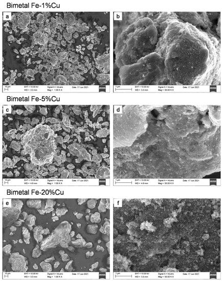 SEM images of Fe-Cu bimetals: Fe-1%Cu (a,b), Fe-5%Cu (c,d), Fe-20%Cu (e,f).