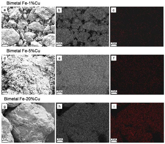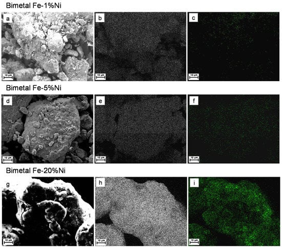 In Figure 4 and Figure 5, the SEM-EDS images and mapping of Fe-Cu and Fe-Ni bimetals are shown. The SEM-EDS analysis was carried out on samples taken from a lab-scale grinding (i.e., 20 g). In Fe-1%Cu (Figure 4c), Fe-5%Cu (Figure 4f), and Fe-20%Cu (Figure 4i), it is possible to notice that Cu (red dots) is homogeneously dispersed in the iron phase with a rising concentration as the dosage of copper was increased. Similar results were observed for Fe-Ni bimetals in Figure 5c,f,i for Fe-1%Ni, Fe-5%Ni, and Fe-20%Ni. Homogeneity of Fe-Cu bimetallic systems, which is synthesized by milling, was also observed in previous studies (e.g., [5,41,47]). Furthermore, homogeneous Ni dispersed in the iron phase in Fe-Ni bimetals, which is produced by milling, was noticed in other works (e.g., [24,38]).