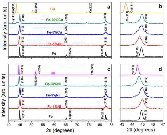 The XRD patterns of the bimetals Fe-1%Cu, Fe-5%Cu, Fe-20%Cu and of milled iron and Cu are shown in Figure 7a,b, whereas those of the bimetals Fe-1%Ni, Fe-5%Ni, Fe-20%Ni and of milled iron and Ni are shown in Figure 7c,d. In the disc milled iron, copper and nickel samples, the only crystalline phases detected by XRD are related to metallic Fe, Cu or Ni, respectively, without macro impurities (see Figure 7a,c). However, the presence of trace elements (in the order of, e.g., mg/kg) could not be excluded for the limits of quantification of XRD analysis.
