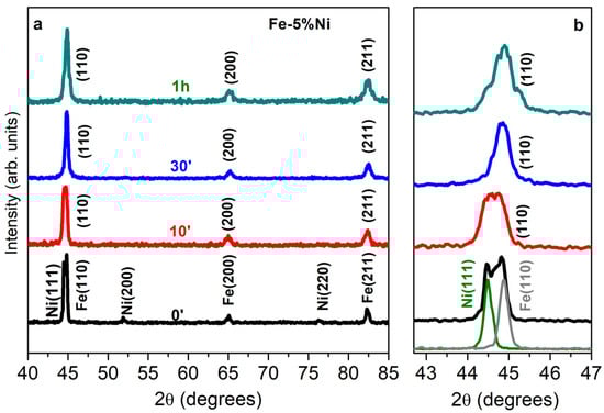 On the other hand, for the Fe-Ni bimetallic phase, a progressive displacement of the (110) peak to a lower 2θ angle is observed as the Ni quantity increases (Figure 7d). These different trends for Fe-Cu and Fe-Ni are possibly due to the different ionic radius of the component elements, which can have an effect on the internal strain of the grains [24,49,50]. In Figure 8, the diffraction patterns of the bimetal Fe-5%Ni milled for 0, 10, 30, and 60 min as compared with the milled iron and Ni are shown. For the unmilled sample (0 min), the diffraction pattern shows the separate presence of the Ni (111) and Fe (110) peaks in the range of 44.2–45.2°, thus suggesting that the Fe-Ni bimetal formation did not occur (Figure 8b). Conversely, for samples milled for 10, 30, and 60 min, only the peaks attributed to the Fe-Ni bimetallic phase are present and the reflections Ni (200) and Ni (220) are no longer present. This behavior is in agreement with the literature [49]. The lattice parameter calculated for all samples remains constant (a = 2.86 Å).