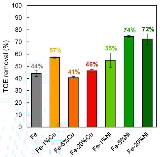 In Figure 9, the results of TCE degradation tests using the different bimetals produced for a reaction time of 1 day are shown. The results achieved using the milled iron powder are also reported as reference. It can be observed that the milled iron powder alone led to a TCE degradation in the gas phase of around 44%. For Fe-Cu bimetallic systems, the best removal performance of around 57% was obtained using the bimetal with the lower Cu content, while by increasing this value, TCE removals of around 41–46% were observed, similar to the results obtained using the disc milled iron. On the other hand, better results were achieved using Fe-Ni bimetals. Namely, adding the Ni content of 1%, it was possible to enhance the reactivity of iron by removing 55% of TCE in the gas phase. Furthermore, by increasing the Ni content to 5%, the best result in terms of TCE degradation was obtained (75% of removal) and the performance remained constant using the bimetal with 20% of Ni (73% of removal). Therefore, higher TCE removals than Fe alone were obtained using the Fe-Ni (1%, 5%, 20%) bimetals or the Fe-Cu bimetals, but were limited to the lowest Cu content (1%).