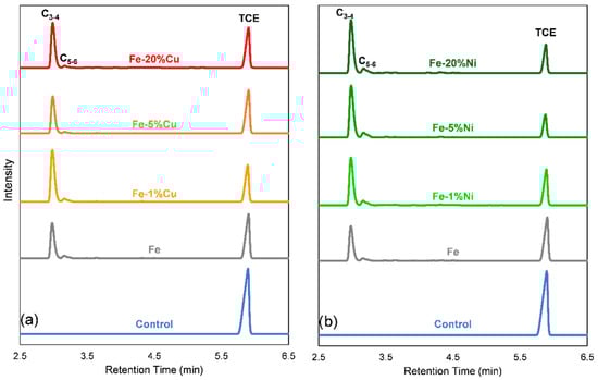 The chromatograms obtained from the TCE degradation tests carried out with 1 day of reaction using Fe-Cu and Fe-Ni bimetals are shown in Figure 10. As reference, the chromatograms obtained at the same time of reaction using disc milled iron (Fe) and without the addition of reactive material (i.e., control tests) are also reported. In the chromatogram relative to the control test, only the TCE peak was present, i.e., no degradation products were detected. In contrast, the addition of a reactive material led to TCE degradation with a consequent formation of various reaction byproducts. Specifically, using disc milled iron and Fe-Cu or Fe-Ni bimetals, the same degradation products were found with various intensities depending on the TCE degradation capacity of the different bimetals tested. In general, the intensity of the peaks of the byproducts is directly related to TCE degradation. In fact, higher peaks of dechlorination products were found in the chromatograms obtained in the tests performed with Fe-Ni bimetals (see Figure 10b) compared with those detected in the Fe-Cu tests (see Figure 10a) due to the better catalytic ability of Ni compared with Cu (see Figure 9). The degradation products observed in this study are similar to those found and identified by Zingaretti et al. [9,10] in degradation tests of TCE in the gas phase, which are carried out using different types of zero-valent iron. In particular, these byproducts were identified as C3–6 hydrocarbons.