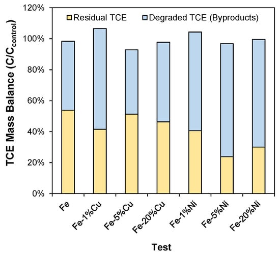 TCE mass balance after the degradation tests using Fe and bimetals results.