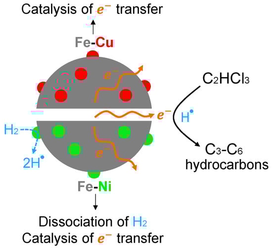 Furthermore, based on the degradation byproducts detected in the tests, it can be assumed that the main degradation pathway of TCE in the gas phase was β-elimination [9,10,54]. From the obtained chromatograms, it is also possible to observe that both disc milled iron and bimetals induced TCE dechlorination via β-elimination, thus suggesting that the addition of a secondary metal does not influence the degradation pathway of TCE, but only catalyzes the reactions. The possible mechanism of TCE removal in the gas phase induced by Fe-Cu and Fe-Ni bimetals is schematized in Figure 12. In particular, the electron transfer occurs through the Fe-Ni or Fe-Cu bimetallic particle, releasing the electrons necessary for TCE reduction. In addition, this phenomenon is accelerated by the presence of Cu or Ni [5,24]. Furthermore, in the Fe-Ni bimetallic particle, the dissociation of H2 is catalyzed and this phenomenon occurs predominantly, releasing the atomic hydrogen useful for TCE degradation [2,16]. The catalysis of electron transfer and the dissociation of molecular hydrogen induced by secondary metals enhance the transformation of TCE in C3–6 hydrocarbons through β-elimination pathway. To a major extent, the increase in the degradation rates occurs for Fe-Ni bimetals, where both effects take place [2].