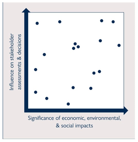 Sustainability reports should present data based on material topics for the company and its stakeholders. Before identifying material topics, the Global Reporting Initiative (GRI) encourages companies to conduct a materiality analysis. Material analysis is the process of determining topics that are considered significant based on economic, environmental, and social impacts and substantially affect stakeholder assessments and decisions [9]. According to ref. [10], materiality is concerned with identifying and prioritizing the most relevant sustainability topics, taking into account the impact of each topic on the organization and its stakeholders. This analysis confirms that material issues are recognized and the company publishes a high-quality sustainability report. Materiality analysis helps improve the quality of sustainability reports. This assessment ensures that material issues are recognized and the company publishes a high-quality sustainability report. The materiality analysis identifies material issues for the company and its stakeholders (i.e., economic, social, and environmental issues) [9].