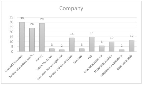 Further analysis identifies how the company determines its material topics. The way the company determines material topics shows how important the company considers the process of deciding material topics for determining the content of the sustainability report. Ref. [13] stated that the materiality analysis process indicates management’s decision to publish certain information. They argued that companies can (intentionally) use the concept of materiality not to disclose negative information. The following Figure 5 describes the methods used by companies in determining materiality topics.