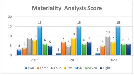 This measurement method follows the methodology in content analysis, which allows qualitative data to be converted into quantitative data systematically and objectively. According to ref. [33], content analysis in reports is carried out by identifying words, sentences, or thematics. This method has been widely used in research that analyses content reports or articles [34,35,36,45,46]. Thus, based on the assessment above, each company will have a maximum score of eight for disclosing its materiality analysis.