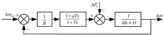 The frequency of the power system is always in the process of dynamic adjustment. According to different time scales, the traditional generator sets will adjust the system’s frequency by inertia response, primary frequency regulation, and secondary frequency regulation to ensure the stable operation of the system. The traditional frequency response (TSFR) model of the power system is shown in Figure 1, and it can be obtained that the frequency response process of the system is a closed-loop process []. The frequency response capability of a traditional power system mainly depends on the parameters of the synchronous generator set and the load response capability of the system.