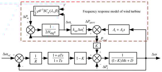 As shown in Figure 2, the improved SFR model consists of frequency response model of DFIG and the traditional frequency response model. The model is proposed after improvement based on the models in [,,,]. Pwind can reflects the change of system frequency by the virtual control strategies and wind speed by the MPPT strategy. The wind power permeability is adjusted through K. The calculation of system parameters is the same as that of TSFR [], and the whole wind farm is equivalent to a DFIG.