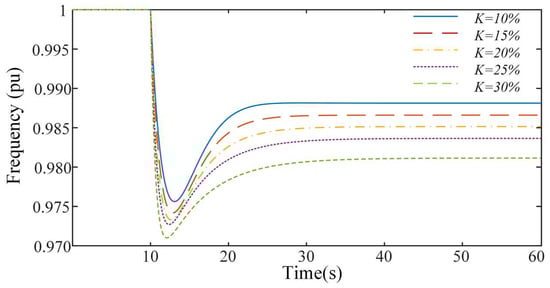 Under the same frequency response control coefficient, the system frequency response curve is obtained by changing the permeability of wind power. It can be obviously observed that with the increase of the wind power permeability, the lowest point of the system dynamic frequency and the steady-state frequency will decrease, which also verifies that the increase of the new energy permeability will reduce the system’s equivalent inertia.