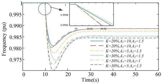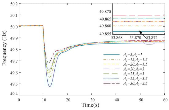 System steady-state frequency is an important parameter to characterize the long-term power quality of the system. In this section, the error transfer function of power disturbance is used to analyze the influence of A1 and A2 parameter settings on the system’s frequency response in case of a power disturbance.