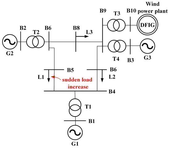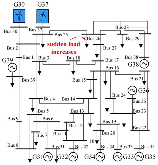 The IEEE three-machine nine-node simulation system with a high proportion wind power grid connection is built by using the MATLAB/Simulink platform. Based on this, this section will verify the effectiveness of the proposed frequency response model of wind power highly penetrated the system and the accuracy of parameter calculation of two frequency response control strategies of the DFIG. The system structure topology is shown in Figure 5.