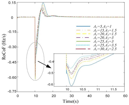 The smaller RoCoFmax is, the stronger the system resistance to disturbance is. With the increasing permeability of the wind power, RoCoFmax will depend on the size of the virtual inertia control parameter A2.