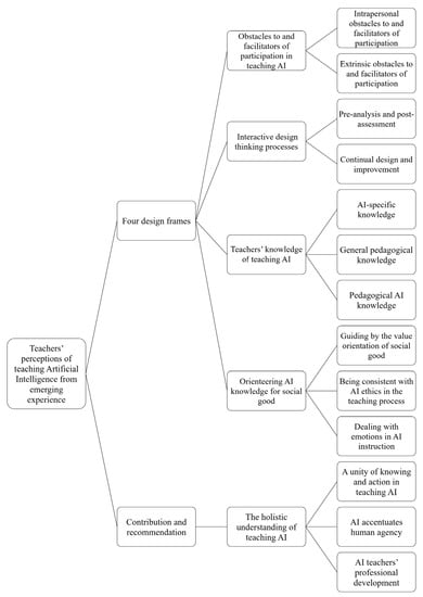 In order to answer the research questions regarding how teachers perceive teaching AI, this study explored the perspectives of design frames from teachers’ emerging experiences. Thus, the final version of 116 meaningful units was retained on the basis of a grounded theory process regarding teachers’ emerging experiences.