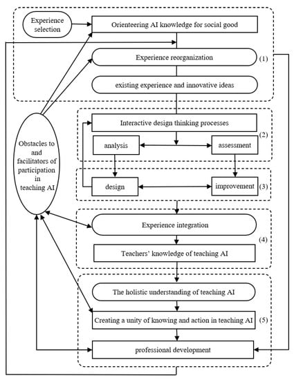 (1) Experience selection and reorganization: This stage identifies and selects effective experiences and methods to address the present problems in the teaching problem context according to teachers’ rich existing prototype (or descriptive) experiences. Guided by orienteering AI knowledge for social good, AI teachers tend to apply experience selection, which means that they should test and innovate on the characteristics of social benefit, authenticity, and usefulness when performing the next step of experience reorganization [39]. Additionally, experience reorganization is highlighted to help teachers identify the differences between existing experiences and innovative ideas. If AI teachers’ experiences achieve the optimal level of teaching AI solutions, they may form a relatively balanced and stable new structure of teachers’ AI teaching knowledge. However, with the constantly changing conditions and deeper understanding, AI teachers face emerging teaching difficulties. Teachers may be concerned about emerging difficulties when external conditions of teaching AI experience change reach a certain threshold. In that case, the equilibrium of teachers’ knowledge of teaching AI could be destroyed. Therefore, AI teachers tend to produce a new balance of knowledge for teaching AI with experience absorption and function recombination. In other words, function recombination could be inherited with experience selection and reorganization to promote AI teaching.
