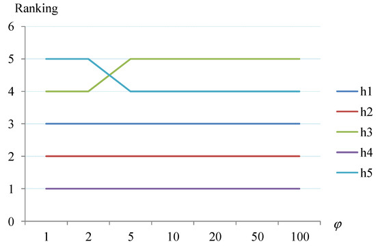where parameter φ is the distance adjustment coefficient. When φ = 1, ; that is, the Hamming distance between δ1 and δ2 [36]. When φ = 2, ; that is, the Euclidean distance between δ1 and δ2. When φ→∞, Equation (7) is reduced to the Chelyshev distance between δ1 and δ2.