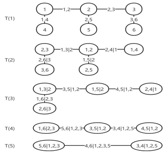 - Ti (i = 2, …, m) represents the ith tree on the vine except T1, and N1 is the node on T1, which meets Ni ∈ N1 ∪ E1 ∪ E2 ∪ E3 ∪ ⋯ ∪ Ei−1.