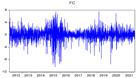 According to the constructed fintech index and the obtained CSI industry index, the time series of return is calculated. Figure 2 and Figure 3 are the sequence diagrams of the return series of fintech and the real economy, respectively. It can be seen that the return mainly fluctuates between −4 and 4, with obvious fluctuation aggregation characteristics. The change characteristic shows that Fintech does not conform to the characteristics of normal distribution.