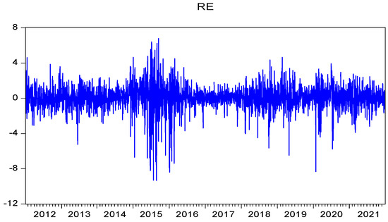 To better fit the residual tail characteristics of time series, the GARCH model is applied in this study as discussed by Heston and Nandi [35] and Ji, Wang and Liseo [36]. The modeling process of the GARCH model is divided into two parts: conditional mean regression and conditional heteroscedasticity regression. The equation form of GARCH (p, q) is as follows.
