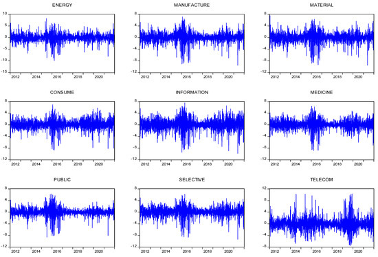 Figure 4 is the return series of the real economy industries index. Most industry indexes have the same variation as the Fintech index, but the fluctuation range is smaller, between −2.5 and 2.5. The return series of selected real economy industries have the characteristics of volatility aggregation, which also shows that the real economy industries index does not accord with the characteristics of normal distribution.