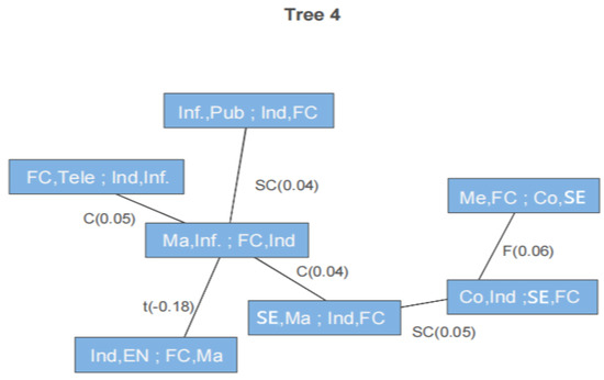 The rank correlation coefficient and upper and lower tail correlation coefficient of the third tree in Figure 7 and the fourth tree in Figure 8 tend to 0, which indicates that the more conditional industries are introduced, the weaker the correlation between industries. When extreme risks occur in an industry, risk transmission tends to spread among the three closely related industries; although the risks cannot be completely dispersed, its impact on other industries is limited.