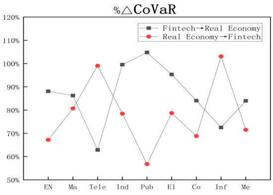 From the research results of the R-vine copula, it can be found that the dependences between Fintech and various industries of the real economy are different, but they have formed a wide range of correlation, indicating a strong risk transmission effect. VaR, CoVaR, ∆CoVaR and % ∆CoVaR are calculated to measure the two-way risk spillover effect. The CoVaR value is generally greater than 4, ∆ Covar is greater than 3 and the% ∆ Covar value is also more than 60%, which indicates that when extreme risks occur in Fintech, it is very likely to have a different degree of negative impact on industries of the real economy, and the risk spillover level is higher than the risk level of the real economy industry itself. Table 7 shows the degree of risk spillover to various industries of the real economy when extreme risks occur in the Fintech industry at the 95% confidence level.
