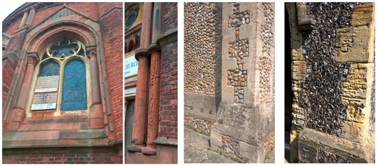 The availability of quality building materials on a local level has resulted in varying construction techniques across Europe. Flint construction and infill feature heavily in Dorset, Wiltshire, Hampshire, Sussex, Kent, Surrey, Berkshire, Suffolk and Norfolk (UK) and have been used in many of those region’s churches []. Examples of typical construction materials can be seen in Figure 1.