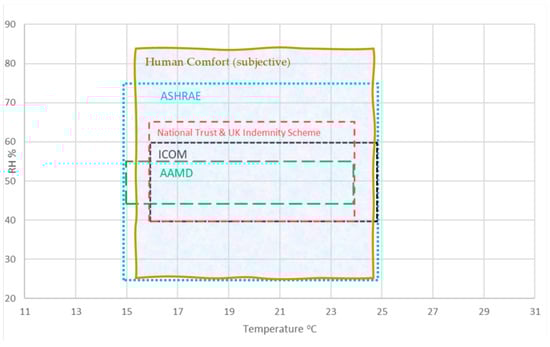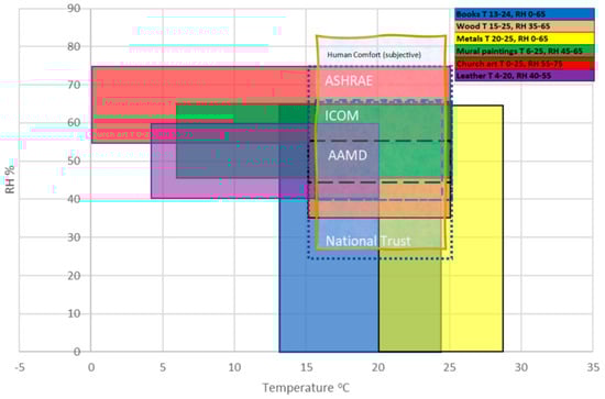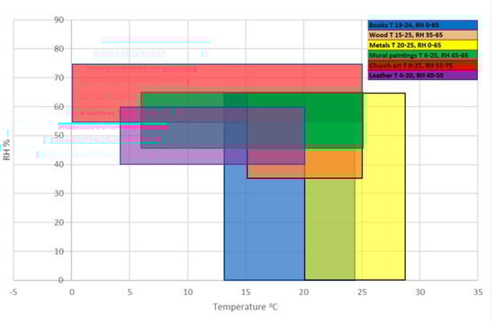 Most historic churches were built without heating systems; therefore, artefacts may have resided within the natural indoor environment for many generations. With the advent and installation of space heating systems, the historic environment has been changed to one that favours human comfort. Legner and Geijer [] highlighted the increasing frequency of the conservation required for wooden artefacts when space heating was installed in old Swedish churches. The most common damages reported were the cracking of paint and desiccation cracks. The desire to achieve human comfort may cause degradation of heritage items [], although materials respond differently to changes in temperature and relative humidity. Items made of wood, for example, take longer to respond to changes than other artefact types. A comparison of the recommended temperatures and relative humidity ranges for artwork, displays and internal spaces are detailed in Figure 2. The data are sourced from four separate studies encompassing microclimate, thermal comfort, hygrometric and climate control research in historic buildings.