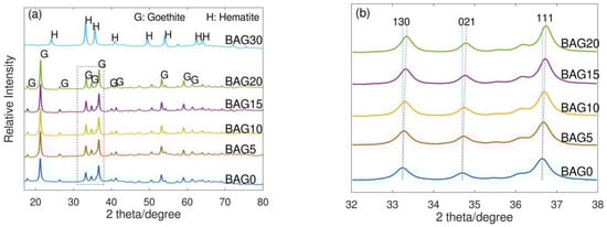 (a) XRD patterns of biochar-supported Al-substituted iron oxide hydroxides with Al/(Al + Fe) mol% of 0 (BAG0), 5 (BAG5), 10 (BAG10), 15 (BAG15), 20 (BAG20), and 30 (BAG30); (b) the amplified XRD patterns at (130), (021), and (111) reflection planes of BAG0, BAG5, BAG10, BAG15, and BAG20, respectively.