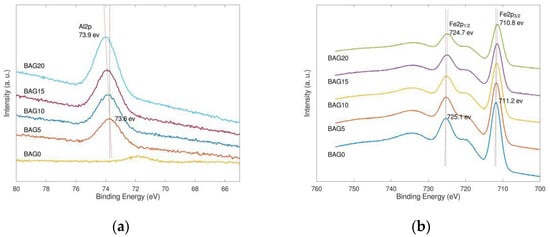X-ray photoelectron spectroscopy (XPS) is a surface-sensitive quantitative spectroscopic technique that can recognize the elements that are within a material or covering its surface, as well as their chemical state [,]. In the high resolution XPS spectra of the as-prepared samples (Figure 2), the characteristic peaks of Al 2p electrons became more significant with the increasing Al substitution amount, which suggested that the successful substitution of Al atoms for Fe atoms in biochar-supported goethite. Meanwhile, such substitution caused a positive shift in the binding energy of the Al 2p shell. On the contrary, Al substitution led to the peak intensity attenuation of Fe 2p XPS spectra, and simultaneously made a negative shift in the binding energies of Fe 2p1/2 and Fe 2p3/2. As Al substitution happened, the structure of goethite on biochar was present with Fe-O-Al pairs. In Fe-O-Al pairs, the electron density around the Fe atom is larger than that in Fe-O-Fe pairs, because the electronegativity of Fe3+ (χ = 1.7053) is stronger than that of Al3+ (χ = 1.5149). This caused the negative shift of the binding energies of Fe 2p. In addition, the formation of Fe-O-Al pairs accompanies the stronger charge coupling because of the heteroatomic hybridization, which led to the positive shift of the Al 2p XPS peaks. Therefore, the XPS spectra of Al 2p and Fe 2p again confirmed the successful synthesis of biochar-supported Al-substituted goethite.