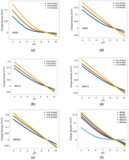 Charge density (C/m2) as a function of pH and NaCl concentration for biochar-supported goethite and Al-substituted samples of (a) BAG0, (b) BAG10, (c) BAG20, (d) BAG5, and (e) BAG15; (f) the comparision of charge density of different Al-substituted samples at ionic strength 0.01 M.