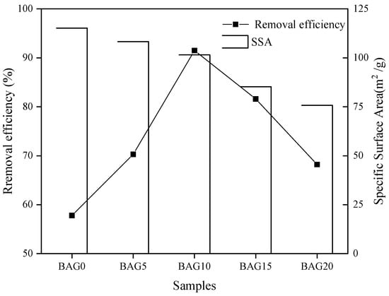 Figure 5 shows the effect of the Al/(Al + Fe) mol% of adsorbent on nitrate adsorption. Obviously, the BAG10 with 10% of Al/(Al + Fe) mol% showed the largest removal efficiency, and removed 91.5% of initial nitrate in solution. By comparison, the BAG0 without Al substitution presented with the lowest removal efficiency, and only removed 57.8% of initial nitrate in solution. When the Al/(Al + Fe) mol% changed from 0 to 10%, the nitrate removal efficiency increased by 33.7%. However, the nitrate removal efficiency decreased significantly when the Al/(Al + Fe) mol% was beyond 10%. The removal efficiency of nitrate reduced by 23.3% after the Al/(Al + Fe) mol% increased from 10% to 20%. Obviously, 20% of Al/(Al + Fe) mol% led to the adsorbent BAG10 with the optimal nitrate removal efficiency, and the BAG10 was selected for the following studies.