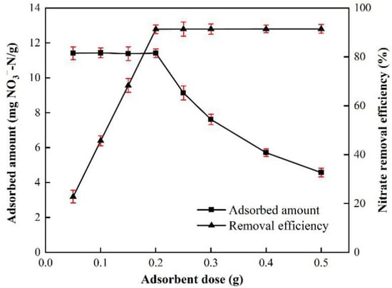 Effect of adsorbent dose on NO3−-N removal onto BAG10 (conditions: C0 = 50 mg/L, adsorbent dose = 0.2 g, contact time = 4 h, and T = 25 ± 1 °C).