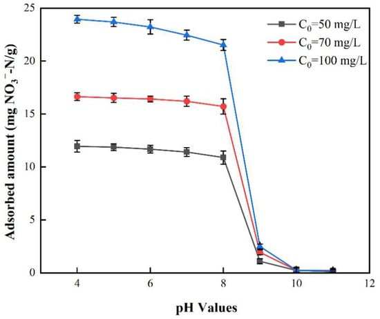 Figure 7 shows the effect of the initial solution pH on nitrate adsorption with different initial nitrate concentrations. The nitrate adsorption was certainly preferable when the initial pH of solution was not greater than 8. For C0 = 50 mg/L, when the pH changed from 4 to 8, the adsorbed amount changed from 11.9450 to 10.8950 mg/L, which was just a slight decrease. However, when the initial pH changed from 8 to 9, the adsorbed amount decreased from 10.8950 to 1.100 mg/L, which was a great decrease. When the initial pH was greater than 9, there was almost no nitrate adsorption. Similar results were also found for C0 = 70 mg/L and 100 mg/L, respectively. Above all, a reasonable nitrate adsorption was observed at the initial pH of 7, which is common in groundwater. Therefore, the initial solution pH was chosen as 7 for the following research.