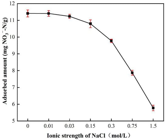 Figure 8 shows the effect of ionic strength on nitrate adsorption by BAG10. The ionic strength was investigated through seven different NaCl concentrations, including 0.00, 0.01, 0.03, 0.15, 0.30, 0.75, and 1.50 mol/L. The nitrate adsorption achieved 11.4125 mg/L without NaCl in solution, but it decreased to 5.7826 mg/L when the concentration of NaCl became 1.5 mol/L. The increase in ionic strength resulted in an almost 50% loss of the adsorbed amount of nitrate. The decrease was slow when the concentration of NaCl was less than 0.15 mol/L, but it became fast when the concentration of NaCl was beyond 0.15 mol/L. Obviously, a lower ionic strength had a low impact on the nitrate adsorption, while a stronger ionic strength resulted in a large negative impact on the nitrate adsorption by BAG10.