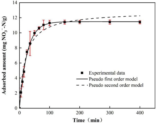 The kinetic experiment was conducted with the following conditions: the dosage of 0.2 g, the solution volume of 50 mL, the initial nitrate concentration of 50 NO3−-N mg/L, the initial pH of 7, the contact time of 4 h, the shaking speed of 150 rpm/min, and the solution temperature of 25 °C. During the experiment, liquid samples were analyzed at 0, 5, 10, 15, 25, 35, 50, 65, 80, 100, 150, 200, 300, and 400 min, respectively.
