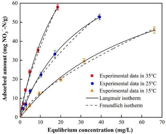 Adsorption isotherm experiments were conducted with different initial nitrate concentrations (5, 20, 30, 60, 100, 150, and 250 mol/L). The other conditions were as follows: the dosage of 0.2 g, the solution volume of 50 mL, the initial nitrate concentration of 50 NO3−-N mg/L, the initial pH of 7, the contact time of 4 h, the shaking speed of 150 rpm/min, and three solution temperatures (15, 25 and 35 °C).