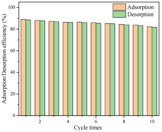 The effect of co-existing anions on nitrate adsorption by BAG10 was investigated with the following combinations: 50 mg/L NO3−-N (blank), 50 mg/L NO3−-N + 100 mg/L Cl−, 50 mg/L NO3−-N + 100 mg/L PO43−, 50 mg/L NO3−-N + 100 mg/L HCO3−, and 50 mg/L NO3−-N + 100 mg/L SO42−. The other conditions were as follows: the dosage of 0.2 g, the solution volume of 50 mL, the initial pH of 7, the contact time of 4 h, the shaking speed of 150 rpm/min, and the solution temperature of 25 °C.