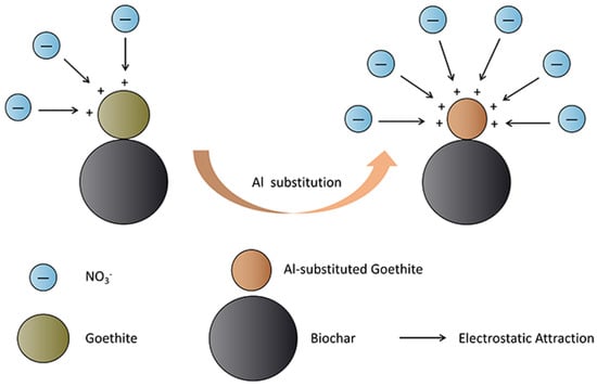 Many studies reported that aluminum substitution in goethite was able to increase the surface charge density of goethite. The crystal structure of goethite determines its surface chemistry properties, especially its surface charge []. In the diaspore structure of goethite, each Fe ion is surrounded by three O2− and three OH− to give FeO3(OH)3 its octahedra. Because of the similarity of ionic radii and the valency of Fe(III) and Al(III) ions, isomorphous substitution for Fe(III) by Al(III) becomes possible []. In fact, goethite is by far the most investigated example of an isomorphous substituted iron oxide, and Al is the best-known example of the various possible substituents in both natural and synthetic samples [,,,,,,,]. Ni et al. found Al-substituted goethite presented with an increase in adsorption capacity of Cr(VI) compared with pristine goethite []. Hsu et al. showed the maximum adsorption capacity of phosphate rose from 135 to 584 mmol/kg when Al/(Al + Fe) mol% changed from 0 to 17.4% []. Tufo et al. suggested that a small incorporation of Al would enhance the adsorption properties of the goethite surface. The enhanced adsorption of anions is supported by the fact that Al substitution could enhance the surface charge density of goethite []. Zhu et al. suggested that the incorporation of Al increased the effective proton reactive sites on the (021) crystal face and caused a rougher surface by the rise of Stern layer capacitance, both of which enhanced the surface charge density of the goethite []. Therefore, Al substitution could increase the surface density of the positive charge of biochar-supported goethite.